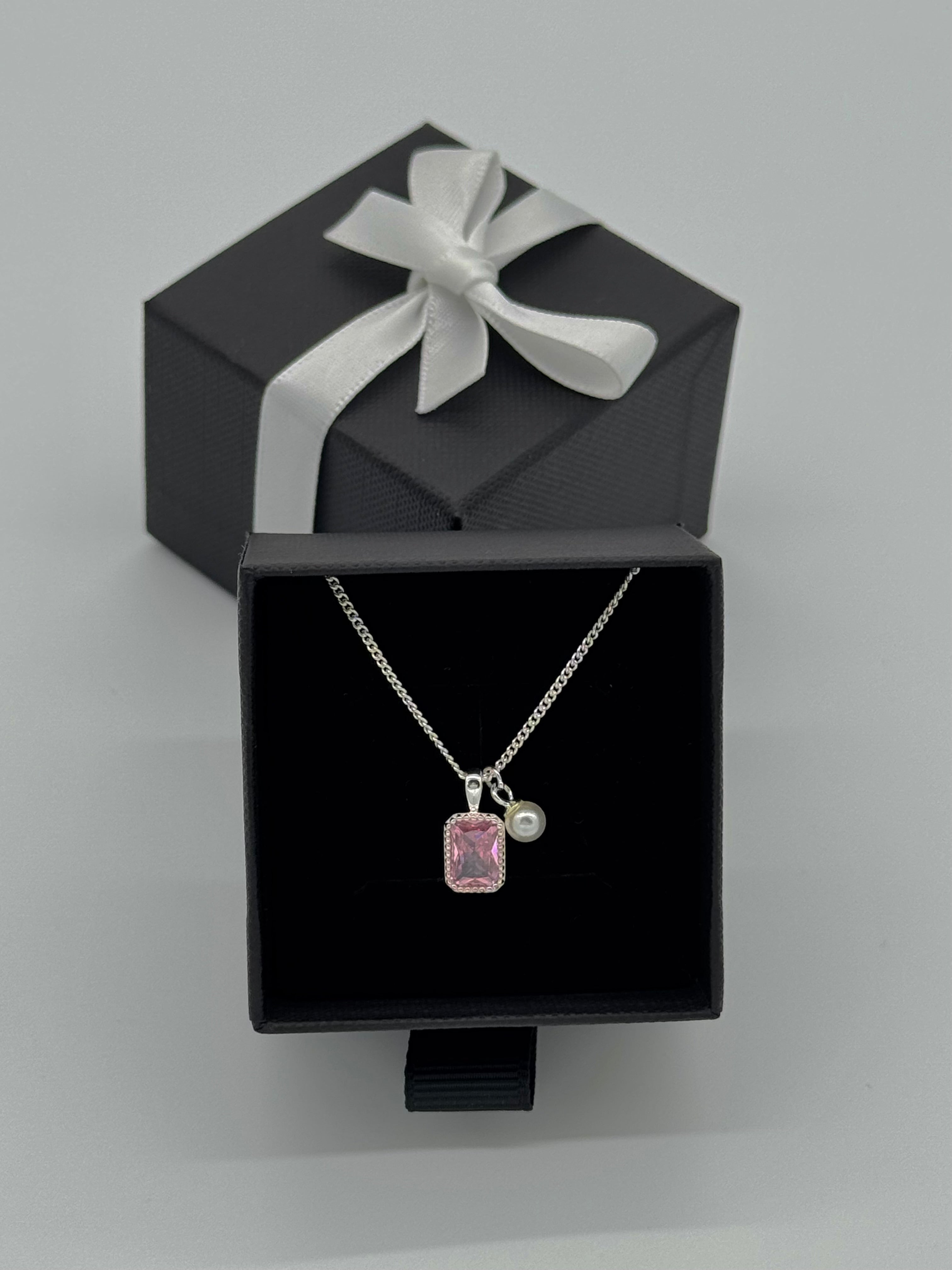 Collier mit edler Anhängerkombination - pinker Baguette Stein, Perle, Herz